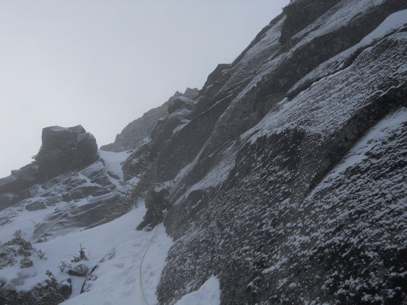 But the mountain had other plans and with the dark night came snow. All night spindrift pushed at the walls of the tent and the soft tinkling of icy precipitation would not stop. In the morning, a brief sun break lured us out of the bivy and onto the route. The few inches of new snow made the going even more difficult than it already was. Conditions were absolute crap and traversing unconsolidated snow over steep ramps was more exciting than it should have been. Dan led two "easy" (in summer!) pitches that took a couple hours each. Our slowing momentum was further hindered by the returning storm. In wind and pouring spindrift we made 7 rappels and bailed back to Leavenworth.